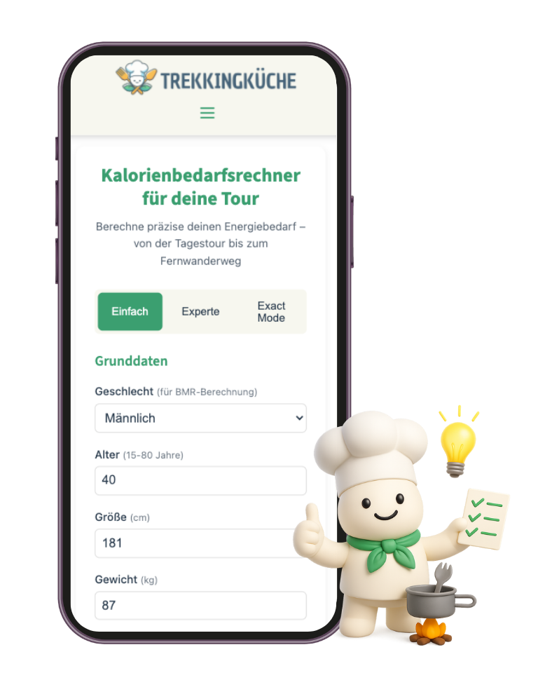Experten-Modus: Für präzise Planung Zusätzlich berücksichtigst du Höhenmeter, Rucksackgewicht, Temperatur und Tourdauer. Der Rechner zeigt dir auch die optimale Verteilung auf Frühstück, Unterwegs-Snacks und Abendessen sowie das exakte Packgewicht bei deiner Kaloriendichte.